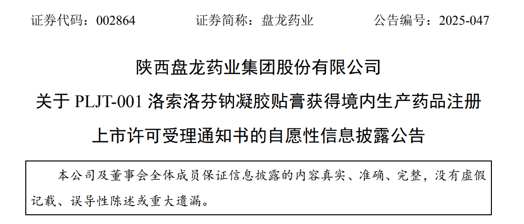 盤龍藥業(yè)PLJT-001洛索洛芬鈉凝膠貼膏上市申請(qǐng)獲受理,鎮(zhèn)痛新藥研發(fā)再提速